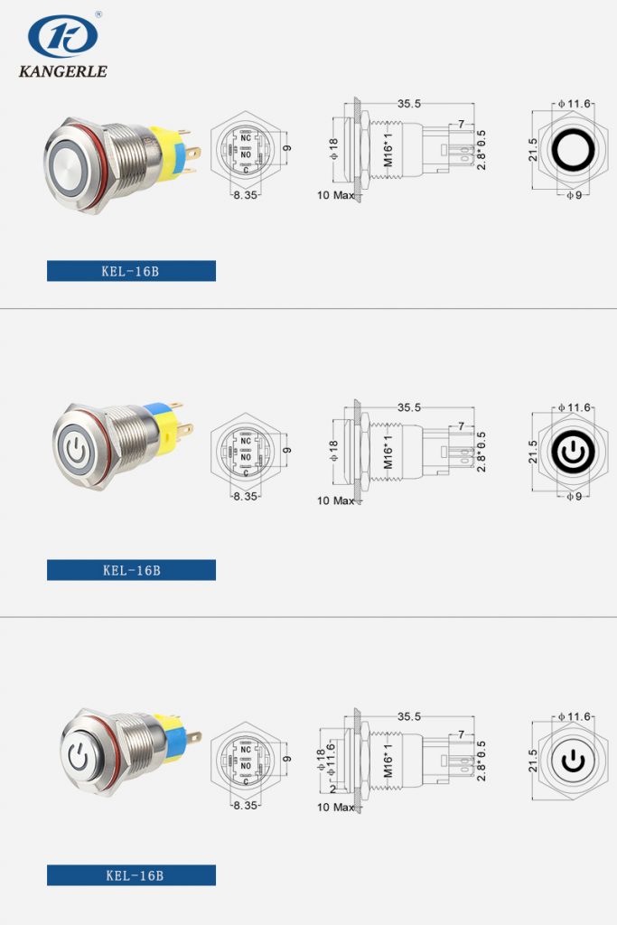 金属按钮开关是一种由金属外壳和按钮构成的开关,比起塑料按钮开关更加坚固耐用,能承受更大的外力作用。它的外观简洁精美,并具有良好的手感和操作性。金属按钮开关防水、防尘、防腐,可以在恶劣的环境下工作,提高了设备的可靠性和稳定性。我司有多种系列和带灯、双灯、自复、自锁、平头、高头、大电流等不同规格的金属按钮可供选择,并配备有对应插件。产品拥有全球安规认证,支持OEM/ODM。